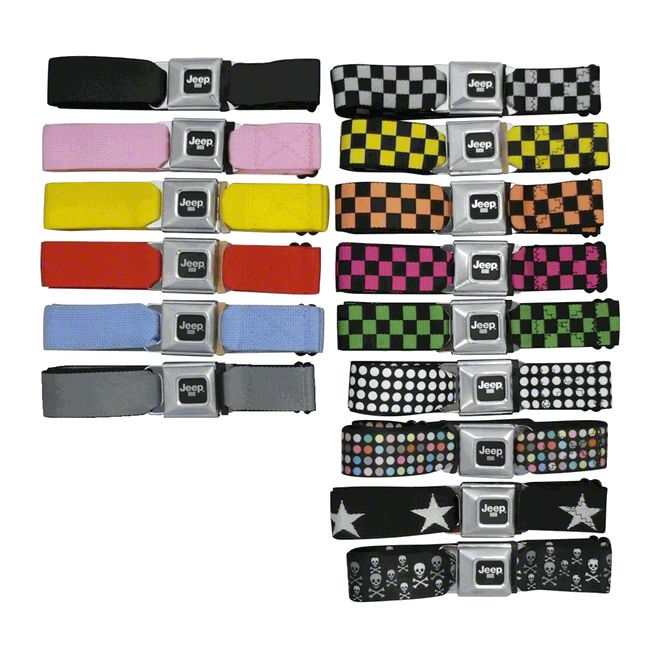Quality Construction. These belts are constructed from tough nylon webbing that is fully adjustable from 24 Inch to 44 inches. The authentic seatbelt buckle has the "Jeep" logo and grill slots. This Belt stays tight keeping your pants right where you want them to be, until you unbuckle! Using an authentic metal seatbelt buckle clasp that really works. Made in the USA from 1-1/2 inch wide webbing this belt features the Jeep logo right in the center of the seatbelt buckle clasp button.