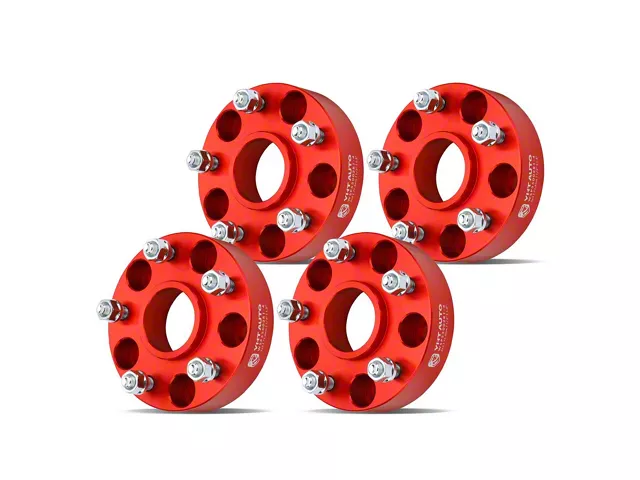 Durable Construction with a Red Anodized Finish. Made from high-strength aluminum, these wheel spacers are built to last while providing optimal performance on and off the road. The red anodized finish not only looks great but also resists corrosion and wear. The spacers come with pre-installed studs for added convenience and a secure fit.