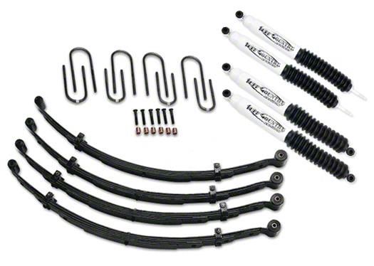 Enhanced Capability. The Tuff Country EZ-Ride Suspension Lift Kit raises the front and rear of 1987-1995 Jeep Wrangler YJ models by 2 inches to improve ground clearance and accommodate larger 32×10.5-inch tires. This comprehensive kit includes heavy-duty SX6000 shocks and front leaf springs engineered to maintain ride comfort and stability under load. The designed lift enhances off-road performance while preserving daily drivability.