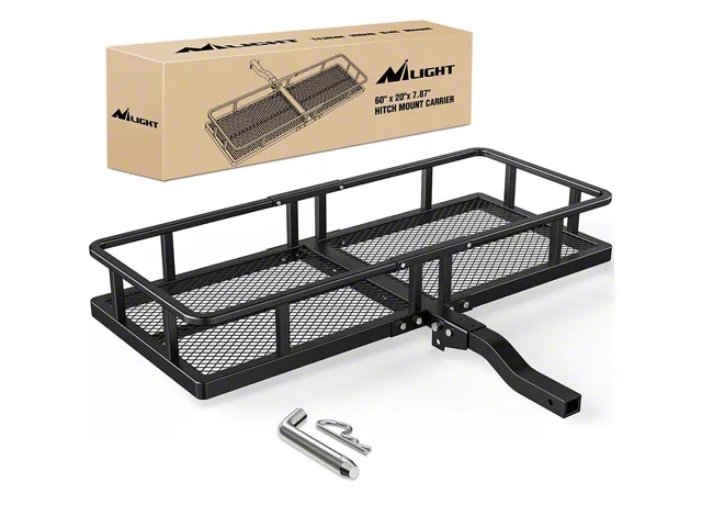 Space-Saving Folding Design for Convenient Storage. The 2-Inch Receiver Hitch Mounted Cargo Carrier; 60-Inch x 20-Inch folds flat when not in use, creating a compact storage solution. This feature prevents interference with your vehicle’s rear and makes it easy to store in a garage or shed, saving valuable space.