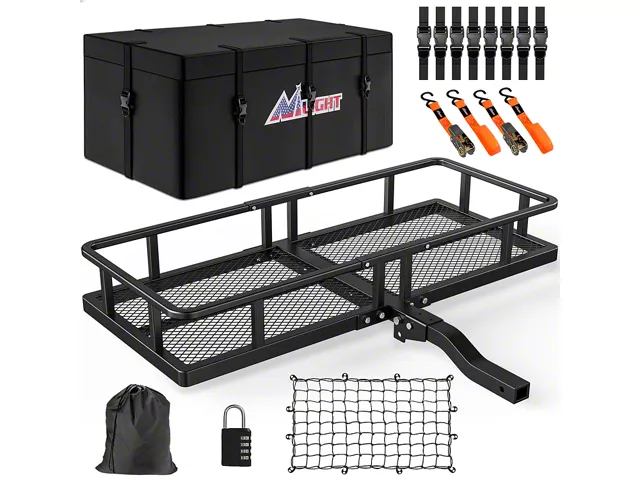 Installation. Installation is quick and easy, fitting into any standard 2-inch receiver hitch. Compatible with cargo bags, nets, and bungees, this carrier offers flexible storage options for various hauling needs.