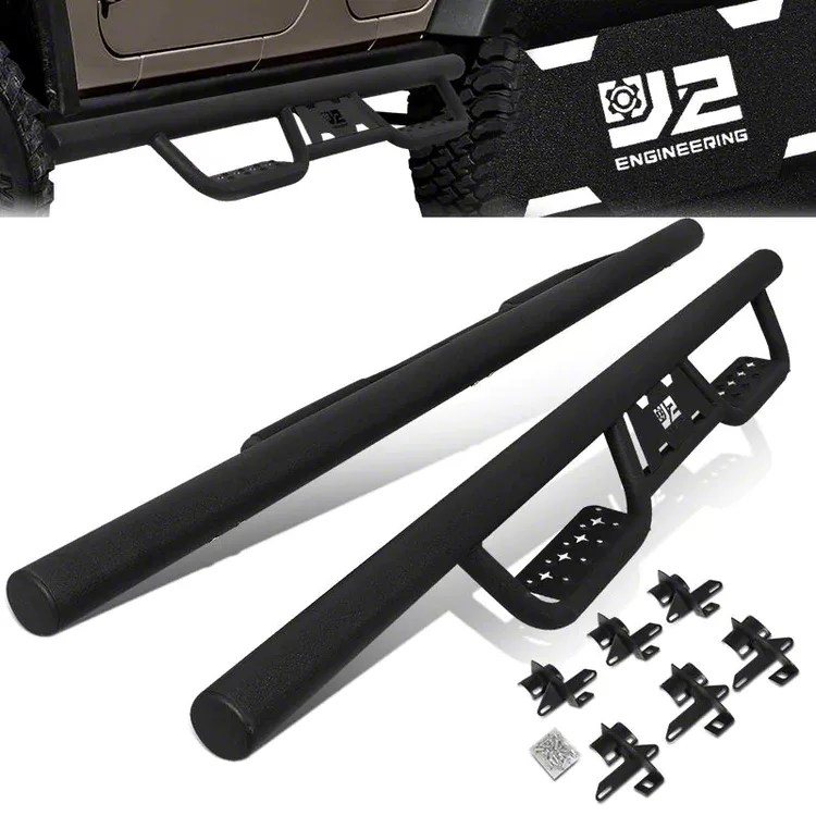 Need a Lift? This pair of 3-Inch Round Drop Side Step Bars feature 3-inch diameter tubes that run the length of the wheelbase and two drop steps with a diamond cleat grip pattern to stand on. They also come with mounting brackets and hardware, bolt-on to your Wrangler, and make access easier for all.