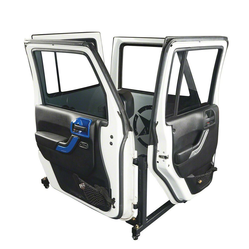 Secure Storage. Removing the top and the door off your Wrangler provides a unique open-air experience that not many vehicles can provide. However, whether you’re driving around mall-crawling or off-roading, you need a safe space to store your doors. That’s where this 4-Door Storage Cart comes into play. Thanks to this simple yet practical cart, you can rest assured your doors are protected against scratches until you’re ready to re-attach them to your Jeep. In addition, the doors will be stored in a vertical position, allowing you to save space in your garage.