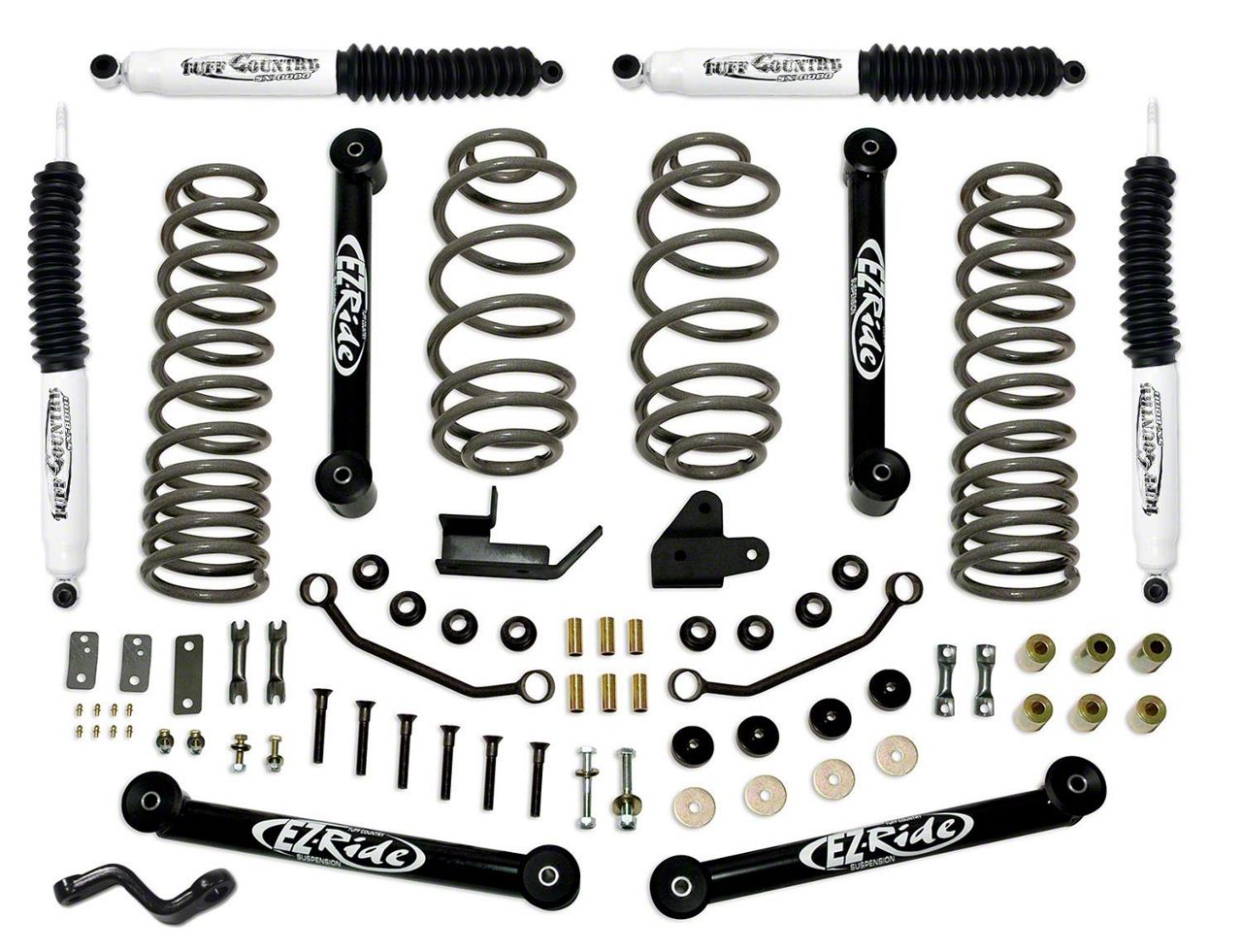 Tuff Country's Jeep Wrangler 4 inch suspension lift kit uses new EZ-Ride coil spring to maintain a comfortable ride and great off-road performance. Lower extended control arms help to maintain proper alignment.