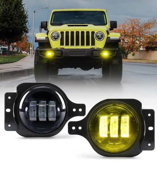 Bright and Reliable LED Fog Lights. The III Series LED Fog Lights deliver bright yellow light output, enhancing visibility in foggy and low-light conditions. With a matte black finish aluminum housing and a clear transparent polycarbonate lens, these 4-inch fog lights provide both style and durability, making them a practical upgrade for your Jeep Wrangler JL.