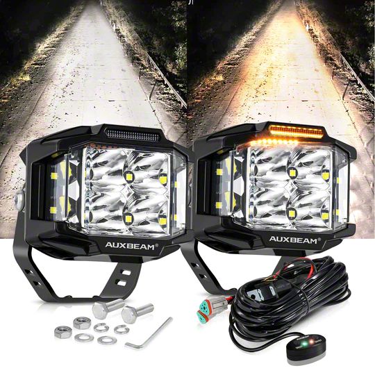 Premium Functional Design. The 4-Inch Square Side Shooter LED Pod Lights with Amber DRL feature a combo beam pattern, providing both spot and flood illumination to cover a wide range of lighting needs. Measuring at a compact 4 inches, these pods are designed for easy installation in tight spaces while still delivering impressive performance. Each light produces a remarkable 46 watts of illumination, ensuring bright and efficient lighting in various conditions. With a remarkable 50,000-hour lifespan, these LED pod lights are built to last, making them a reliable choice for off-roading, work vehicles, and any other situation where reliable, high-quality lighting is essential.