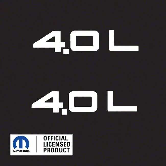 Construction and Features. Crafted with a glossy white finish, these side logos provide a durable and eye-catching look for your Jeep Wrangler. The stylish 4.0L text design is officially licensed by Mopar, ensuring quality and compatibility with your vehicle. The set includes two logos, allowing you to install them on both sides of your Wrangler for a balanced and professional look.