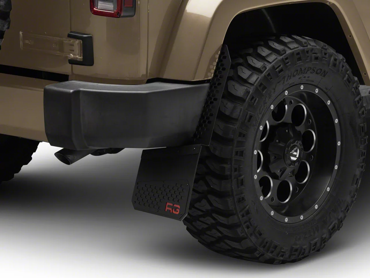 Construction and Appearance. Made from heavy gauge stainless steel brackets and flap plates with a matte black powder coating, these mud flaps resist rust and are built to last. The flexible poly flap material absorbs impacts and adapts to different terrains. The offset bracket design ensures clearance for oversized tires and contributes to the aggressive off-road look.