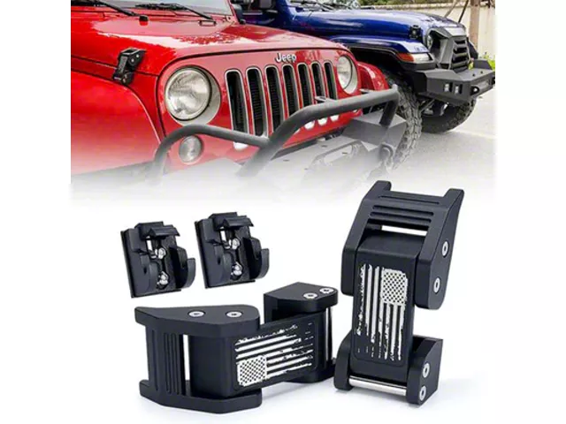 Rugged Off-Road Styling. The Aluminum Hood Latch Kit with Distressed US Flag (Black) is the perfect blend of form and function for your vehicle's aesthetic and practical needs. Crafted with precision, this kit showcases a distinct Distressed US Flag design that adds a touch of uniqueness to your vehicle's exterior. Its rugged off-road styling not only enhances the visual appeal but also ensures durability for the most demanding terrains.