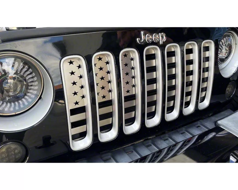 Description. The Jeep Wrangler JK Front American Flag Grille is a perfect combination of style and patriotism, offering a rugged and iconic look while proudly displaying the American flag. Premium brushed stainless steel finish with your choice of plain style or optional line color to proudly represent your affiliation; choose blue, red, or green vinyl line color. This grille is made to show-off your allegiance as well as stand up to the off-road experience. Fabricated from brushed stainless steel and features easy do-it-yourself installation.