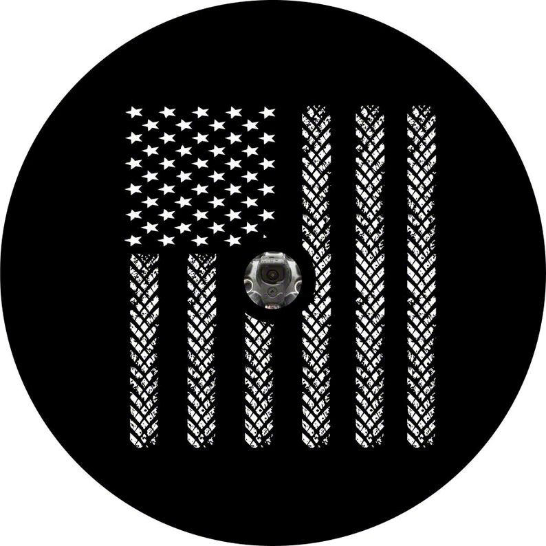Application. This American Flag Tire Tracks Spare Tire Cover with Camera Cutout in Black fits all 2018-2026 Jeep Wrangler JL models.
