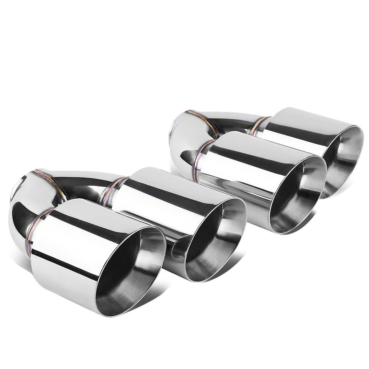 Construction and Appearance. Built from high-quality stainless steel, these tips ensure lasting durability against heat, corrosion, and wear. The double-walled construction adds strength while helping to preserve a clean finish over time. The polished exterior delivers a mirror-like shine that complements modern and performance-focused builds, while the angled cut and dual round design emphasize a premium, sporty look.