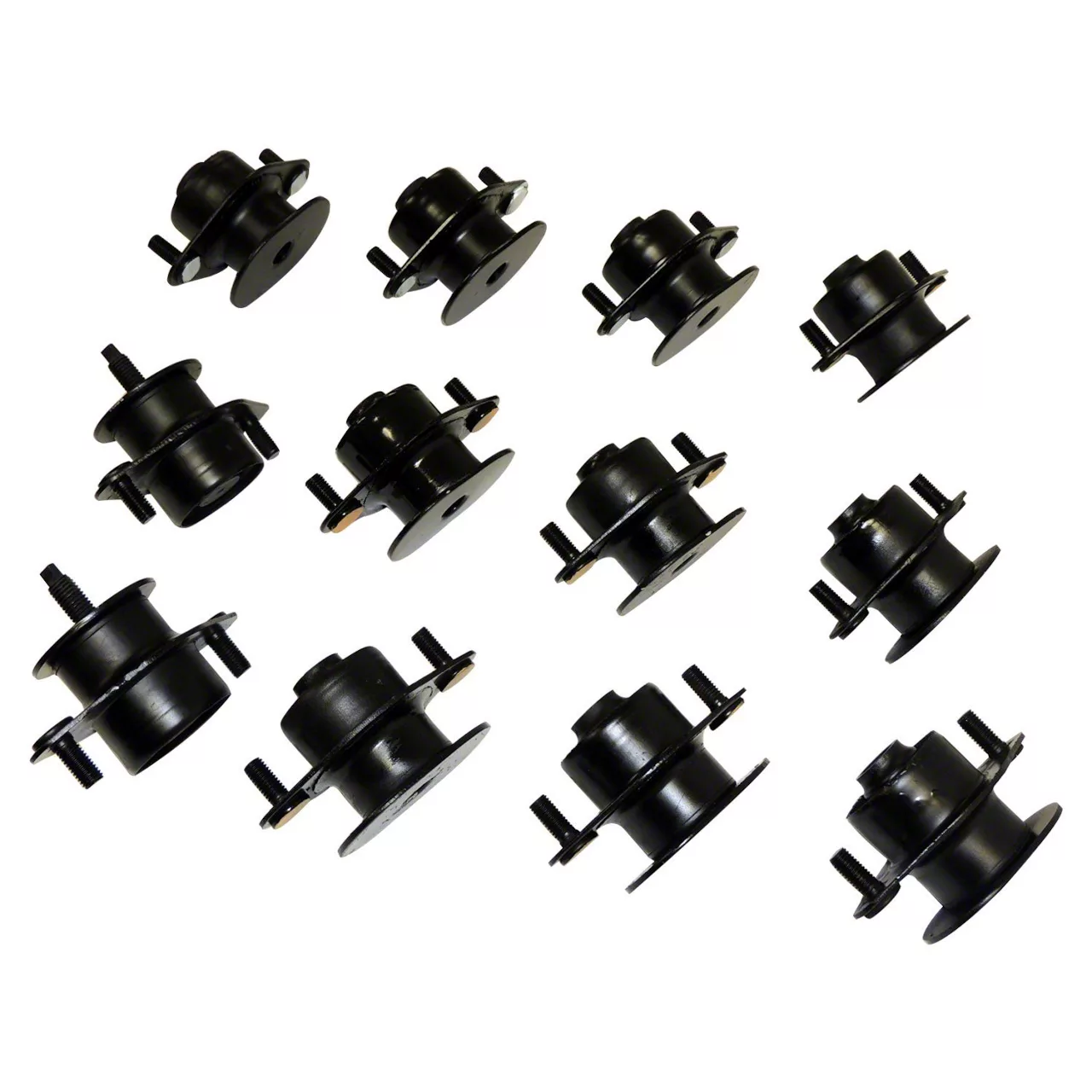 Superior Construction Quality. These body mounts are made from durable rubber and feature steel hardware. Rubber body mounts ensure a much more comfortable ride than polyurethane mounts and are more likely to last longer. This body mount set of 12 comes in black and provides excellent corrosion and rust resistance.