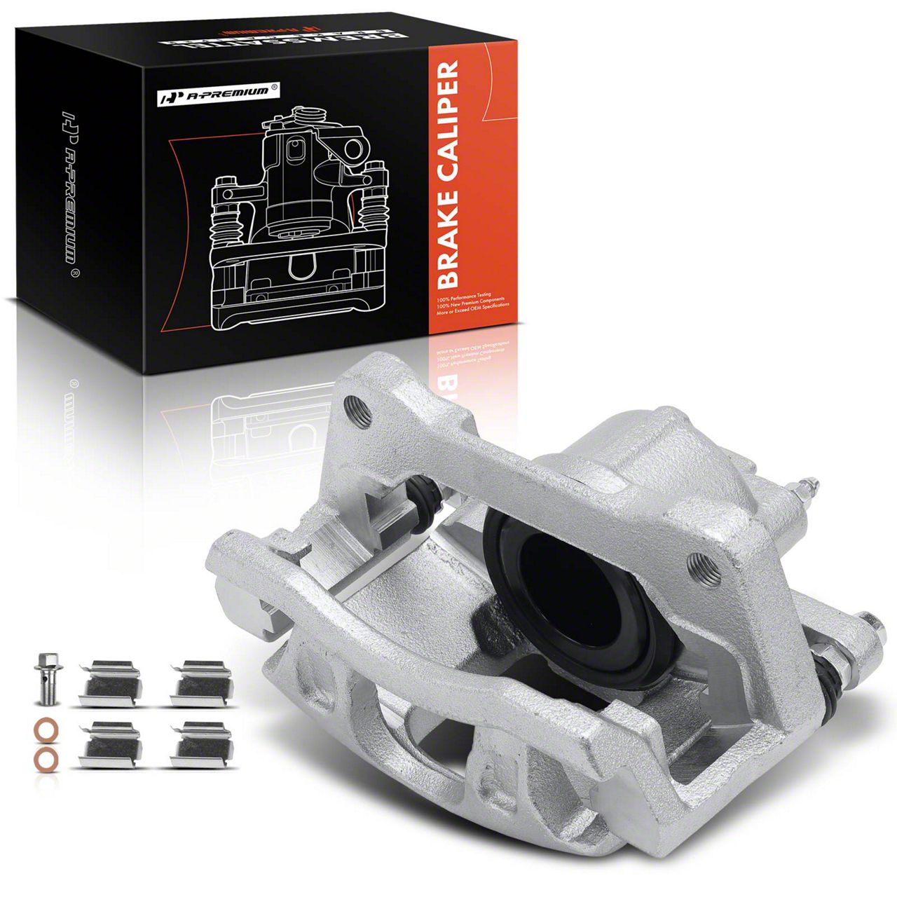 Construction and Appearance. Constructed using durable materials with a phenolic piston for heat resistance and longevity, this brake caliper features a robust bracket and includes essential installation hardware. The caliper is finished to resist corrosion and wear, providing lasting operational reliability and a professional look.