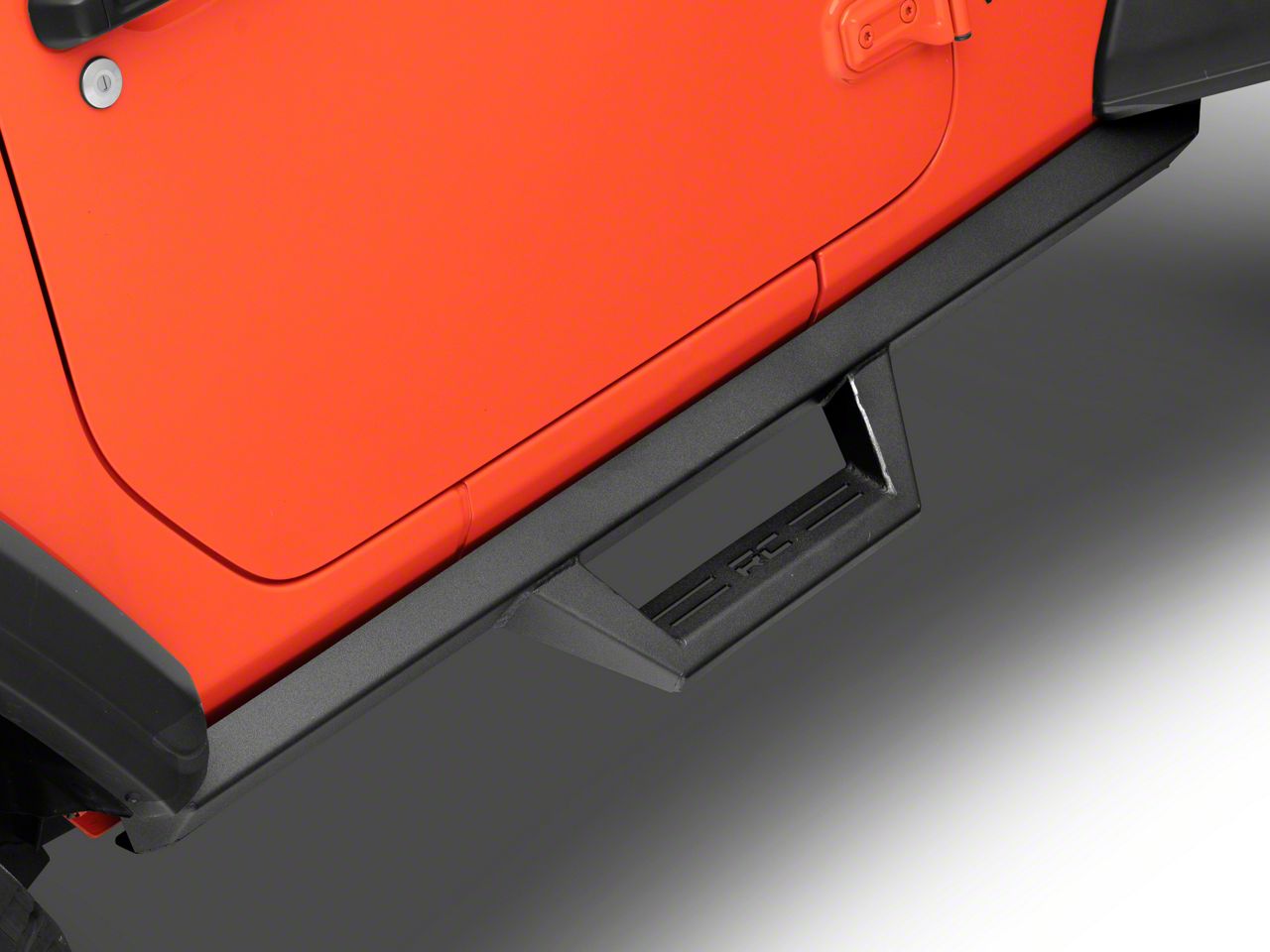 Construction and Appearance. Crafted from solid steel, these steps feature a durable powder-coated black finish that resists corrosion. The laser-cut logo adds a distinctive accent while the contoured design seamlessly matches the Jeep JL body lines for a factory-level aesthetic.