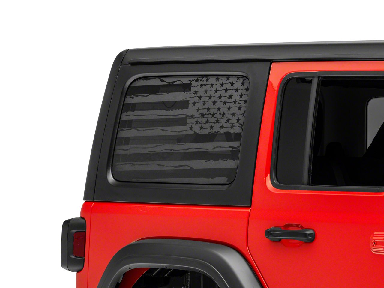 Application. These SEC10 Distressed Flag Hard Top Window Decal; Matte Black are designed to fit 2018-2026 Hard Top Jeep Wrangler JL 4-Door models. Driver and passenger side decals included.