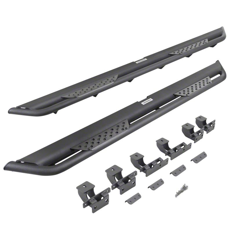 Dual Purpose Step Bars. Whether you're hitting the trails or just hopping in and out of your vehicle, the Dominator Xtreme DT Side Step Bars in Textured Black will make your life easier while keeping your vehicle safe. These side step bars not only provide you with a secure and convenient entry and exit point but also double as sliders to protect your vehicle's rocker panels. Step into confidence with the innovative triple-bar design, which ensures maximum stability and grip. The full-length outer and lower rub rails give you the peace of mind you need while navigating rough terrain, preventing damage to your vehicle's body.