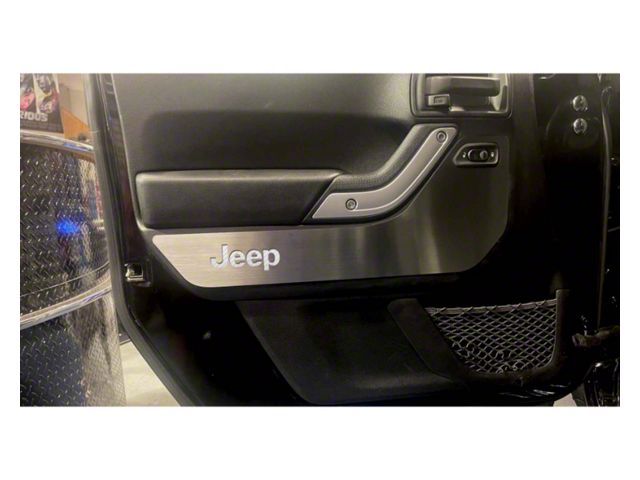 Description. Introducing the new Jeep Wrangler JK Brushed Front Door Guards Brushed with Jeep Logo and Rear Door Badges from American Car Craft. These stainless steel door guards stand out with a brushed finish and stunning Jeep logo in Carbon Fiber vinyl inlay; they will enhance any Wrangler JK's interior. The American Car Craft craftsmanship ensures a high-quality product that is durable and resistant to wear and tear, so you can rely on them for years to come. The rear door badges offer a stylish finishing touch to your Jeep, and ensure that you stand out from the crowd. Get your own set today and be proud of your Jeep Wrangler.