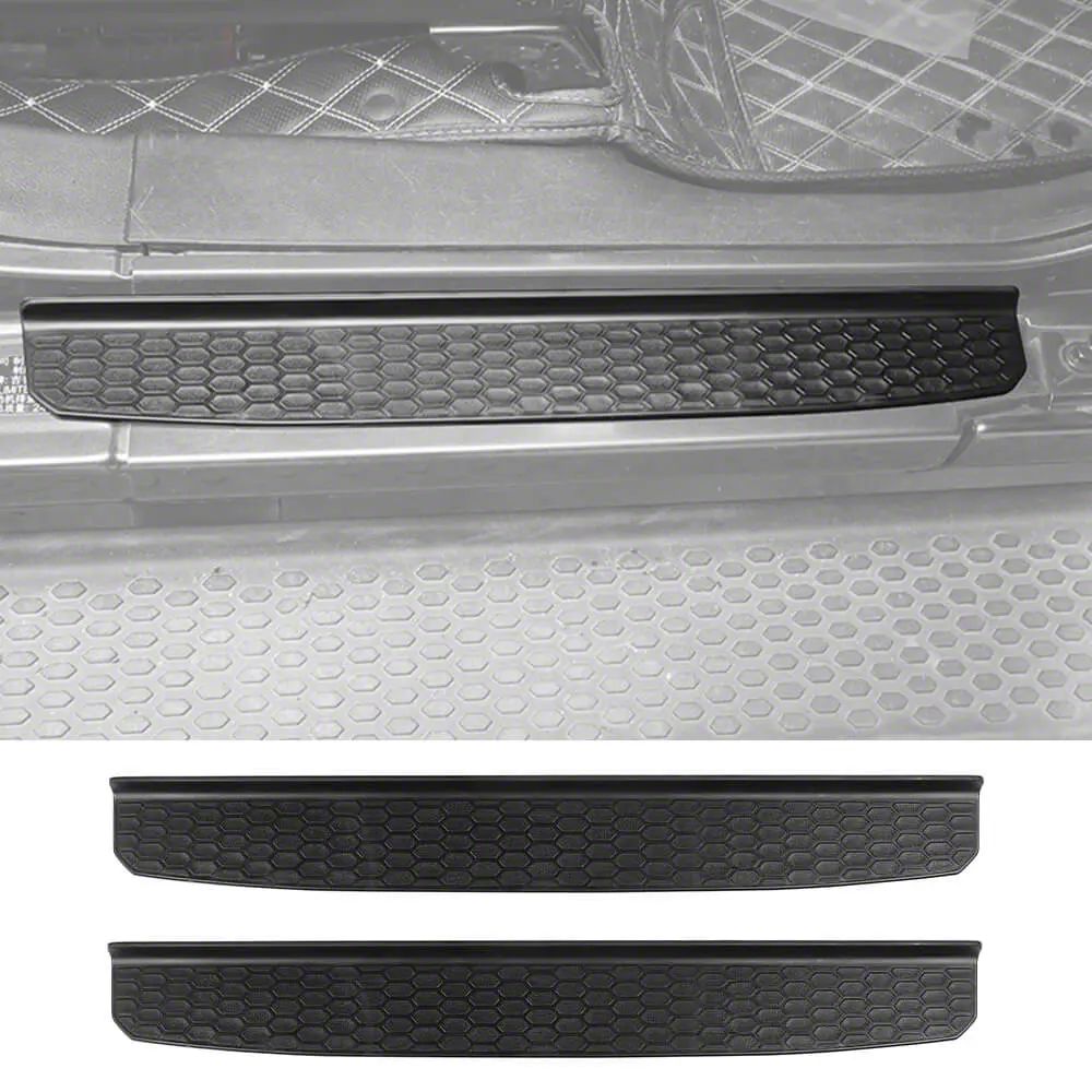 Durable Door Sill Protection. The Door Sill Plate Protectors; Black Honeycomb provides a robust shield for your vehicle's door sills, protecting against scuffs, scratches, and paint damage caused by frequent entry and exit. Designed to enhance safety with a non-slip pattern, these protectors improve both the look and functionality of your vehicle's entry areas, offering essential coverage where wear commonly occurs.
