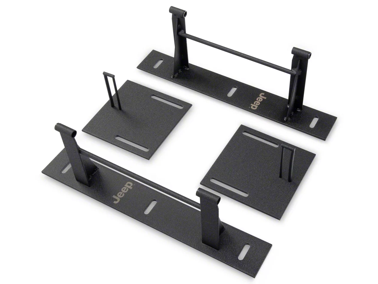 Durable Construction. These Jeep Licensed by RedRock Door Storage Hangers are crafted from 3/16-inch steel plate for reliable strength and stability. Each Hanger is completed in a durable textured black powder coat finish for long lasting corrosion resistance. The hinge mounts include a bushing insert to prevent damage and unnecessary wear to your JK's door hinge pin.