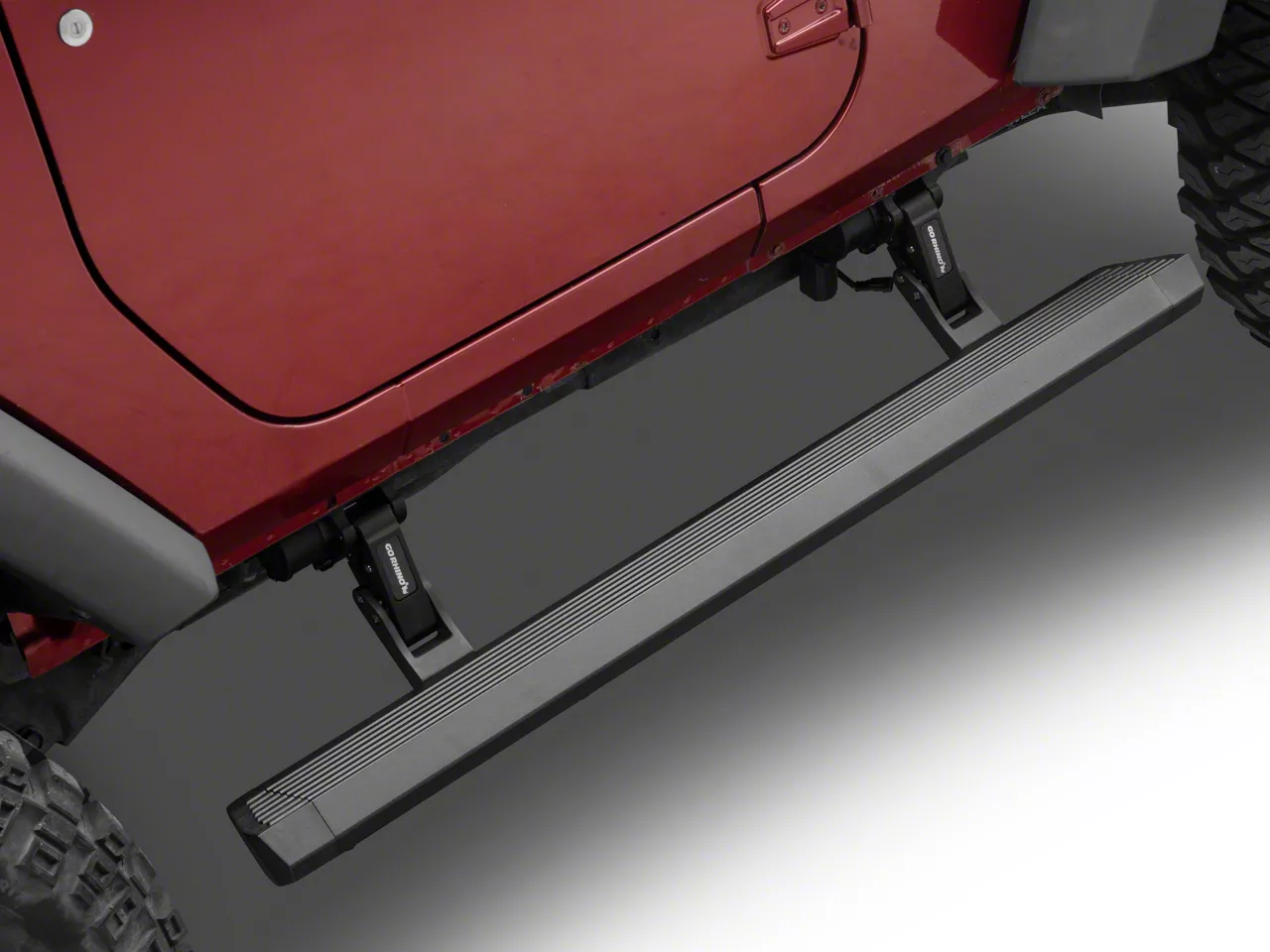 Smart Access Upgrade. The Go Rhino E-BOARD E1 Electric Running Boards are engineered for style, convenience, and performance on 2007-2018 Jeep Wrangler JK 2-Door models. Designed to automatically deploy when doors open, these boards provide sturdy access and retract for a sleek appearance. Ideal for all-season use, they support daily comfort while improving vehicle accessibility.