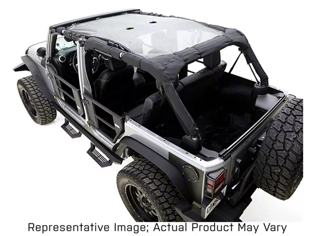 Block Out the Sun. Tired of sun rays pounding your seats and passengers with the top down. That’s why you need the Jeep Wrangler Extended Mesh Shade Top. This cover offers a black mesh top that blocks against UV rays to protect your paint and seats from damage.