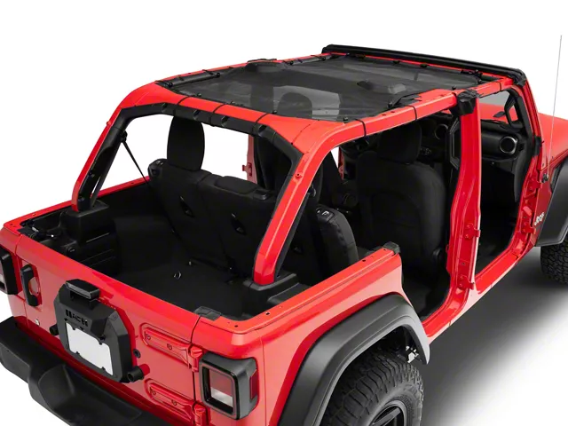 Application. This Black Mesh Extended Mesh Shade Top fits 2018-2026 Jeep Wrangler JL 4-door models.