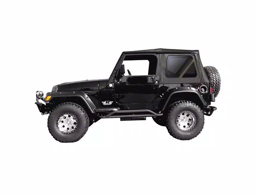 Replace your aging, worn out factory soft-top and gain some additional storage space inside the driving compartment. All the features of the original factory top with exclusive Rampage additions which includes two zippered storage pockets. Produced in original factory specifications and colors. The Rampage replacement top easily installs over factory framework, attaches to factory mounting points and Original Equipment belt rail attachment System. Fits all factory applications. Includes upper door skins that slip over the OE upper doorframes in either clear or tinted windows. For half door applications only.