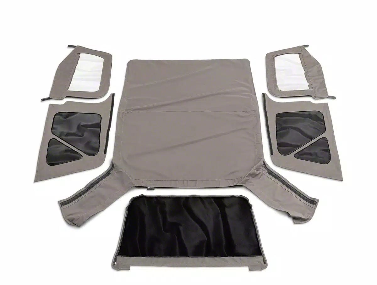 Construction and Appearance. Made from tough military khaki fabric, this soft top is both UV- and mold-resistant to withstand the elements and maintain its color and strength over time. The DOT-approved tinted windows provide added privacy and reduce glare while preserving visibility.