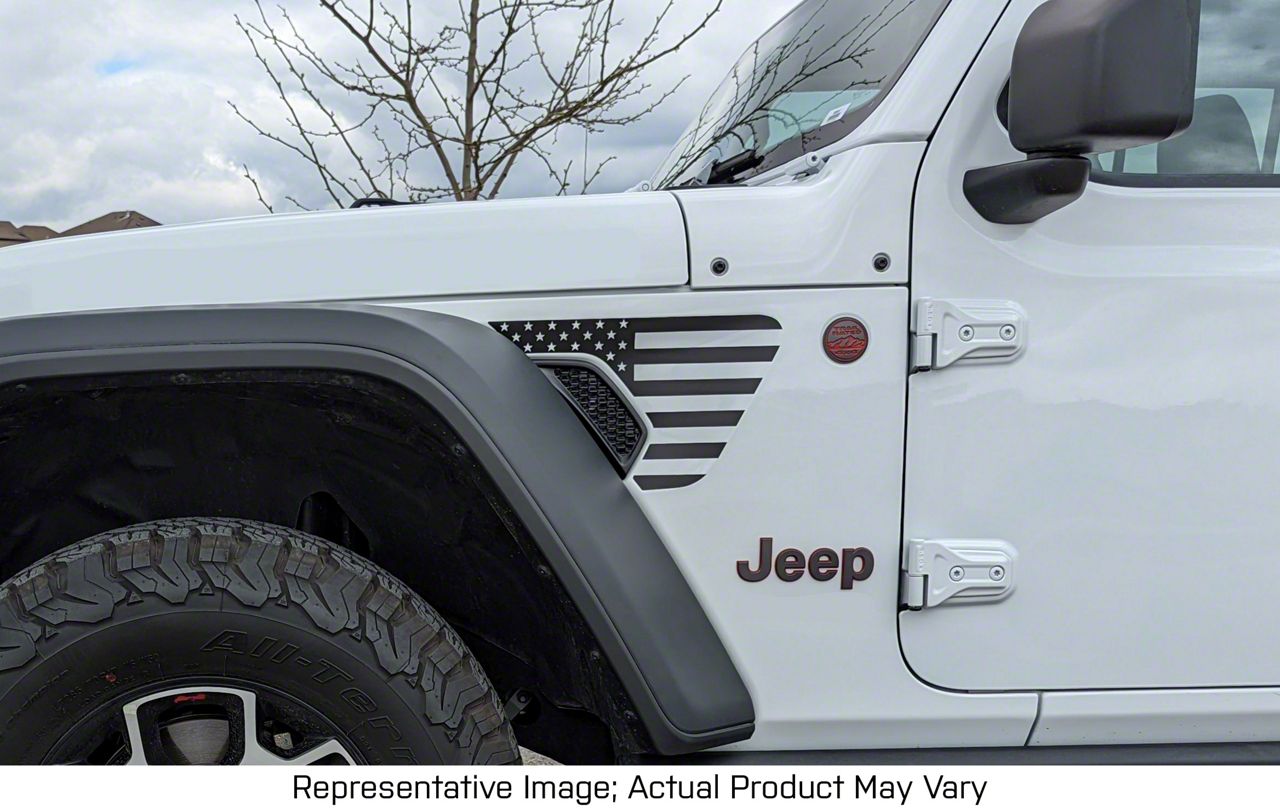 Unique Flag Design. Upgrade the look of your Jeep Wrangler JL with the Fender Flag Vent Decals. These decals are the perfect addition to any Jeep enthusiast's collection, adding a unique and stylish touch to your Fender flag vents. The top-class vinyl material and precise cut measurements ensure a perfect fit, while the pre-applied pressure-activated adhesive makes them easy to attach without any special tools or expertise.