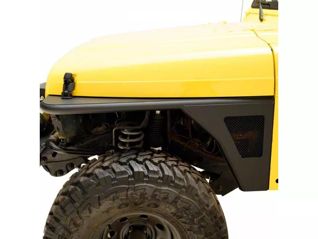 Rugged and Sturdy Upgrade. Give your Wrangler's paint and body panels the ultimate protection with the Front Armor Fender Flares with LED Lights. This pair of front fender flares provide protection against brush, stones, and other trail hazards. They give 3 inches of fender flare coverage and also increase your tires’ clearance. These fender flares also come with a mesh insert and LED turn signal lights for added illumination.