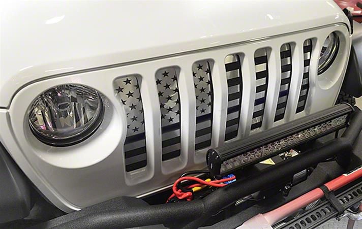 Patriotic Front Styling. The Front Grille with American Flag Design adds a bold and distinctive look to the front of your Wrangler while maintaining proper airflow to the radiator. This grille enhances the vehicle's appearance with a patriotic theme that stands out on the road or trail. The Front Grille is an excellent upgrade for Jeep owners looking to personalize their vehicle with unique styling.