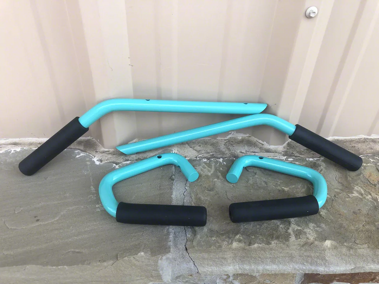 Sturdy Off-Road Grab Handles. Access the cab of your raised Jeep with style and increased safety with these Tropical Breeze Teal Front and Rear Grab Handles. These grab handles provide a firm grip when mounting your vehicle. They also offer your passengers something rock-solid to hold on to when negotiating uneven terrain. With these grab handles, you’re all set to take your Jeep to the most challenging roads.