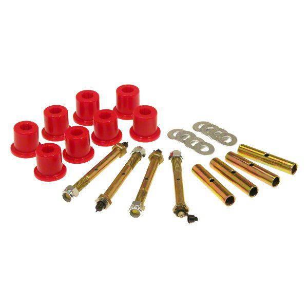 Construction and Appearance. This kit features durable raw metal hardware and matte red bushings crafted for strength and long-term reliability. The included bushings and sleeves are engineered for a snug OE-compatible fit, offering resistance to wear, corrosion, and heat for consistent performance under harsh off-road and daily driving conditions.