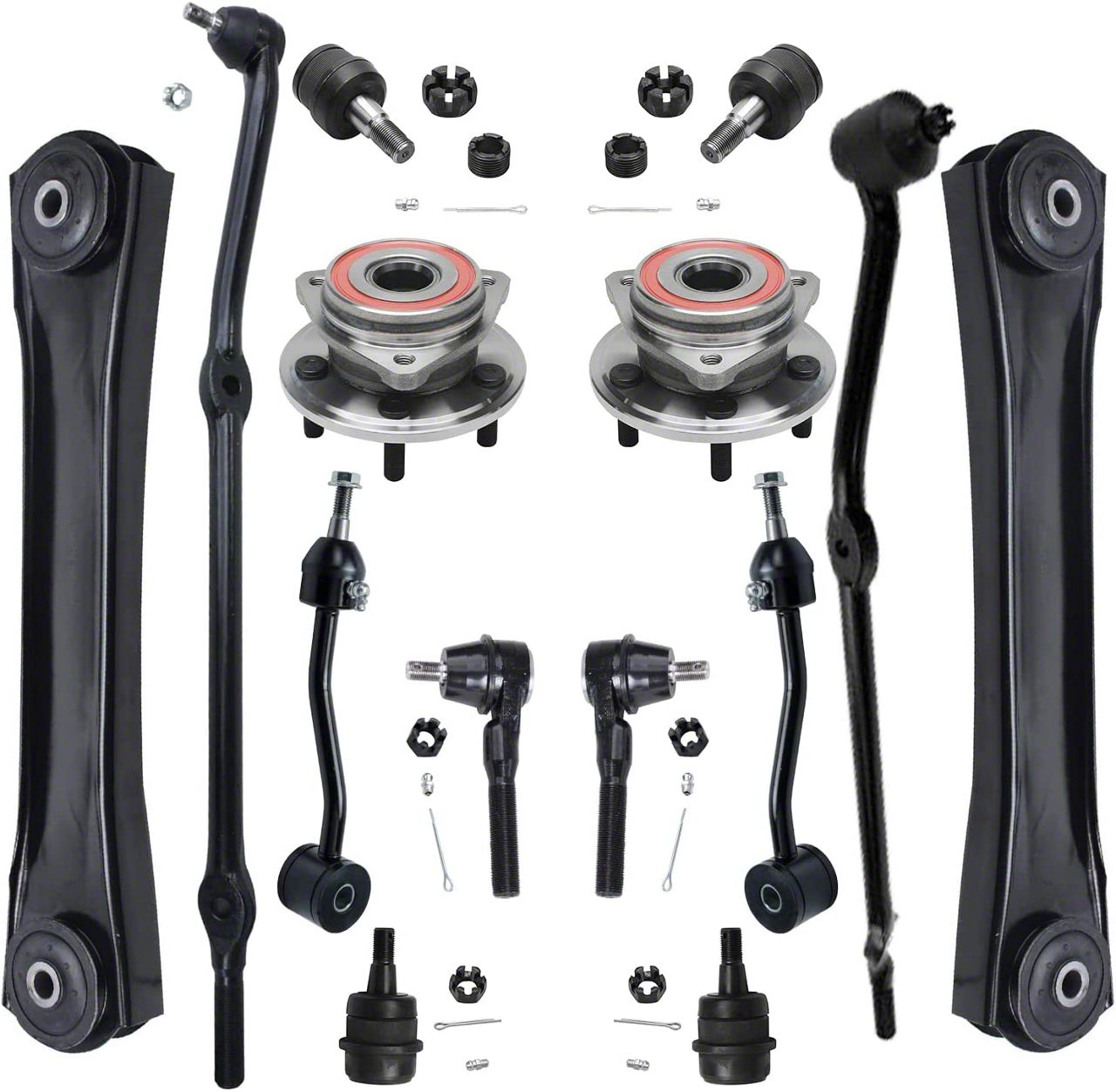 Comprehensive Suspension and Steering Kit. The Wheel Hub Assemblies Kit is a complete solution for restoring and enhancing the suspension and steering performance of your 2000-2006 Jeep Wrangler TJ without ABS. This 14-piece kit includes control arms, tie rods, a drag link, sway bar links, ball joints, and wheel hub assemblies to ensure optimal vehicle handling and stability.