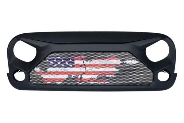 Application. This Matte Black Gladiator Series Mesh Grille with Distressed U.S. Flag is intended for all the 2007-2018 Jeep Wrangler JK models.