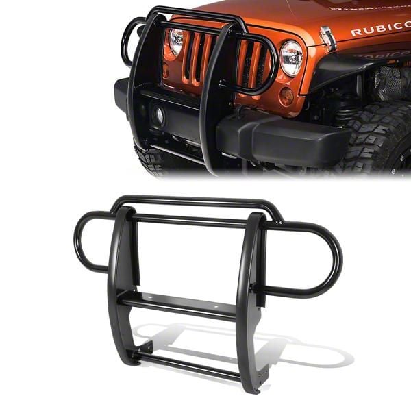 Robust Front Protection. The Grille Guard not only enhances the rugged aesthetic of your Jeep but also offers formidable protection to the front end. It is especially designed to shield the Jeep Wrangler's headlights and includes pre-drilled holes for mounting additional fog lights, making it essential for off-road driving and harsh conditions.