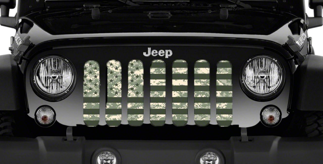 Personalize Your Jeep. This Grille Insert; American Flag Digi Green Camo will customize your Jeep in your own way. Rest assured, it will not compromise the integrity of your grille. Your radiator and engine compartment still gets the proper airflow needed to perform.