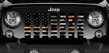 Personalize Your Jeep. This Grille Insert; American Orange Camo Flag will customize your Jeep in your own way. Rest assured, it will not compromise the integrity of your grille. Your radiator and engine compartment still gets the proper airflow needed to perform.