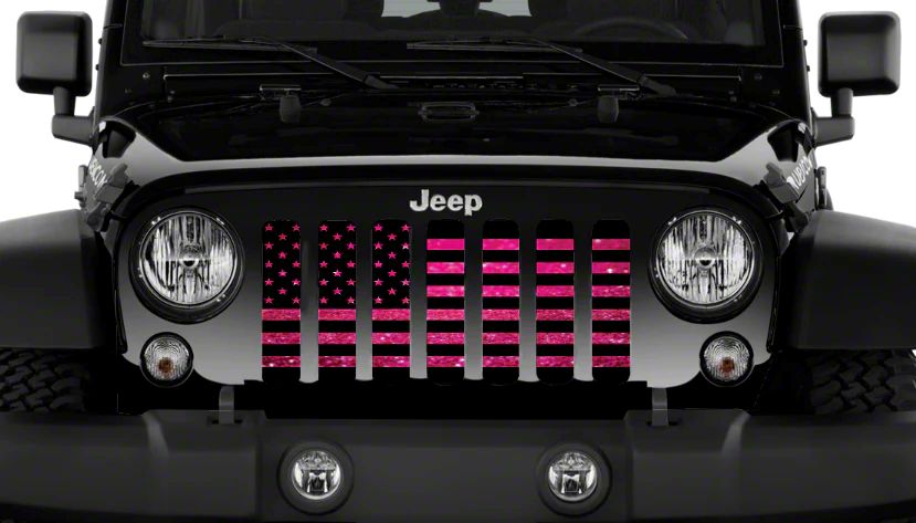 Construction and Appearance. Constructed from rust-resistant, perforated aluminum, this grille insert features a black American flag with a bright pink fleck design. The powder-coated and clear-coated finish ensures durability and long-lasting appeal.
