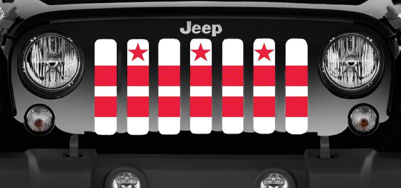 Personalize Your Jeep. This Grille Insert; District of Columbia Flag will customize your Jeep in your own way. Rest assured, it will not compromise the integrity of your grille. Your radiator and engine compartment still gets the proper airflow needed to perform.