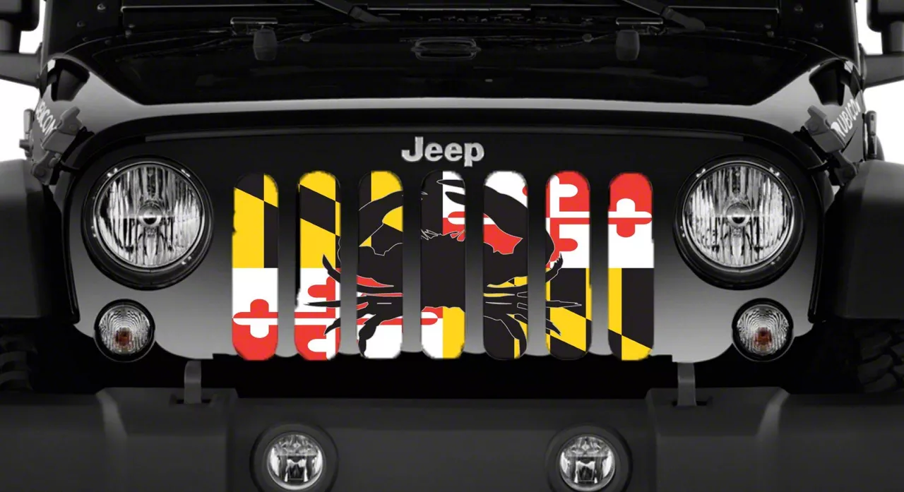 Personalize Your Jeep. This Grille Insert; Maryland Crab Flag will customize your Jeep in your own way. Rest assured, it will not compromise the integrity of your grille. Your radiator and engine compartment still gets the proper airflow needed to perform.