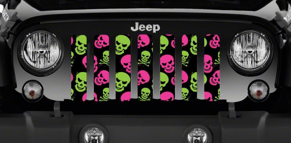 Personalize Your Jeep. This Grille Insert; Pink and Green Skulls will customize your Jeep in your own way. Rest assured, it will not compromise the integrity of your grille. Your radiator and engine compartment still gets the proper airflow needed to perform.