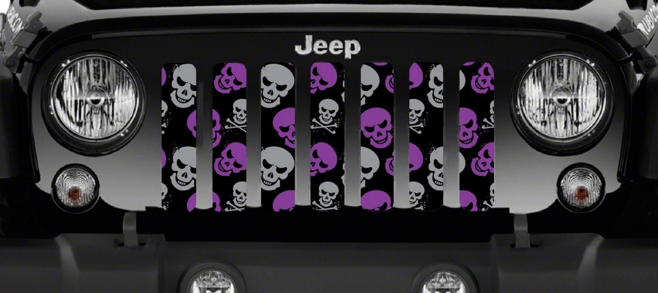 Personalize Your Jeep. This Grille Insert; Purple and Gray Skulls will customize your Jeep in your own way. Rest assured, it will not compromise the integrity of your grille. Your radiator and engine compartment still gets the proper airflow needed to perform.
