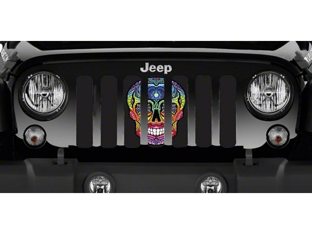 Personalize Your Jeep. This Grille Insert; Sugar Skull Rainbow will customize your Jeep in your own way. Rest assured, it will not compromise the integrity of your grille. Your radiator and engine compartment still gets the proper airflow needed to perform.