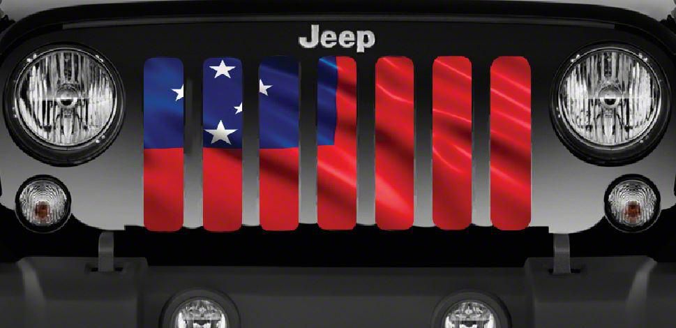 Personalize Your Jeep. This Grille Insert; Waving Samoan Flag will customize your Jeep in your own way. Rest assured, it will not compromise the integrity of your grille. Your radiator and engine compartment still gets the proper airflow needed to perform.