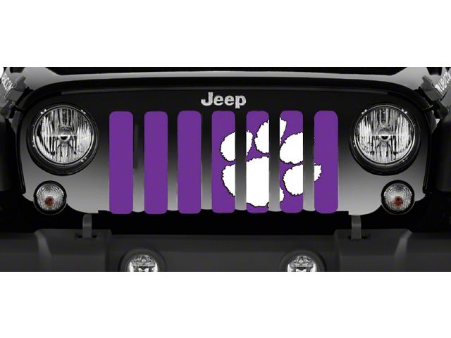 Personalize Your Jeep. This Grille Insert; White Tiger Paw Print Purple will customize your Jeep in your own way. Rest assured, it will not compromise the integrity of your grille. Your radiator and engine compartment still gets the proper airflow needed to perform.