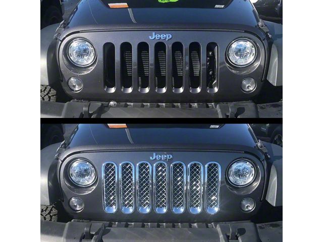 Striking Grille Upgrade. Add a head-turning look to your Jeep with this 7-piece Grille Overlay; Chrome. It boosts your vehicle’s style with its striking style while also keeping your vehicle’s engine protected against debris with its durable quality. With this 7-piece set, your Jeep will look even more set to conquer treacherous roads than before.