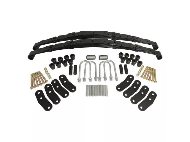 Includes All Hardware and Accessories Necessary For Installation. In addition to the pair of rear leaf springs themselves, each Heavy Duty Rear Leaf Spring Kit includes heavy-duty rubber leaf and pivot bushings, 4 sets of heavy-duty shackles, corrosion-resistant zinc hardware, and new U-bolts.