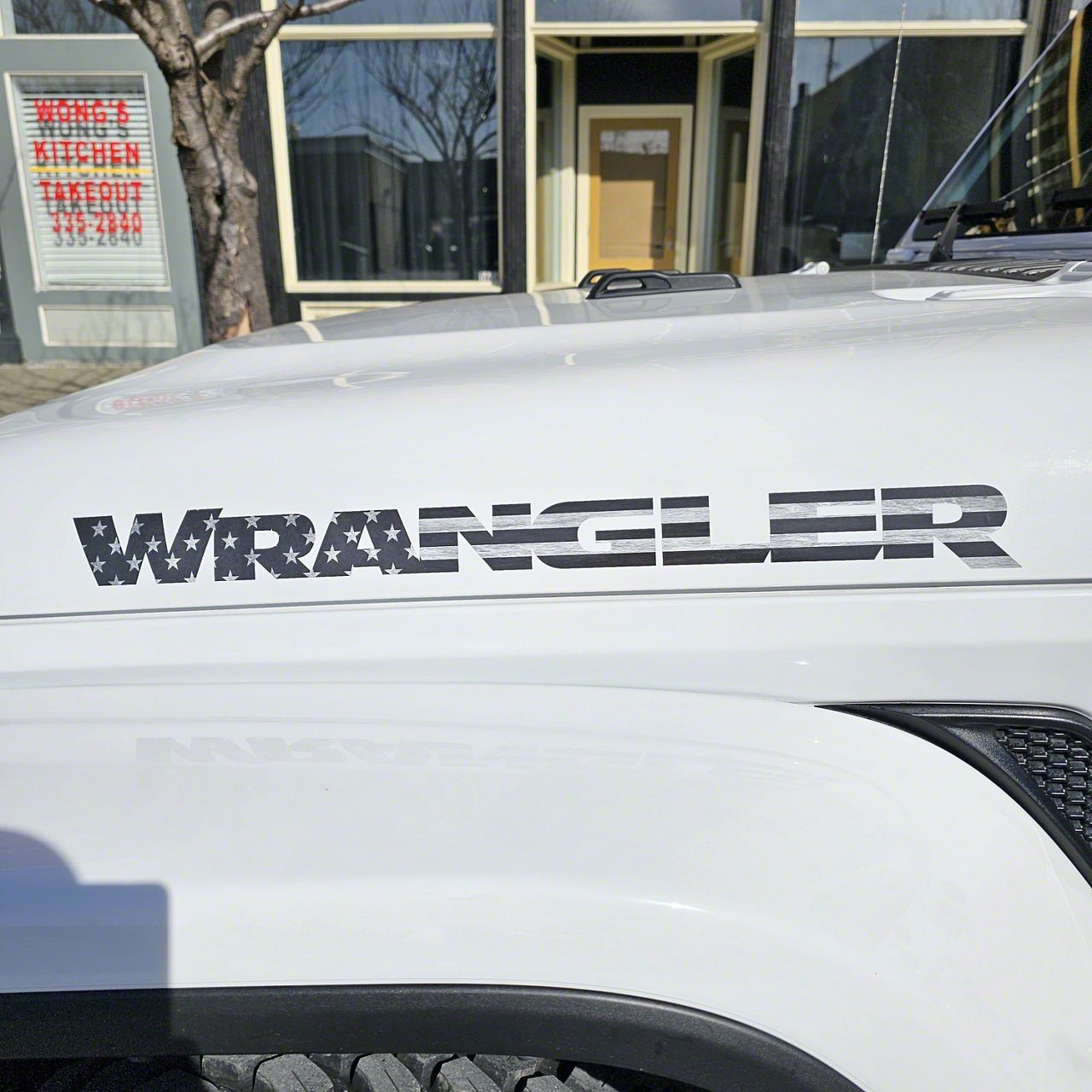 Application. This WRANGLER Hood Decal; Black and White Distressed American Flag fits 2007–2026 Jeep Wrangler JK and JL models.
